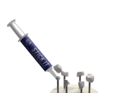 Custom refractory peg material that stabilizes the restoration by syringing the material into a crown which forms a secure peg. Also can be used to repair cracked pressable cores and all ceramic margins and can hold veneers in place during the stain and glaze firings. Stick-It is freeze stable.